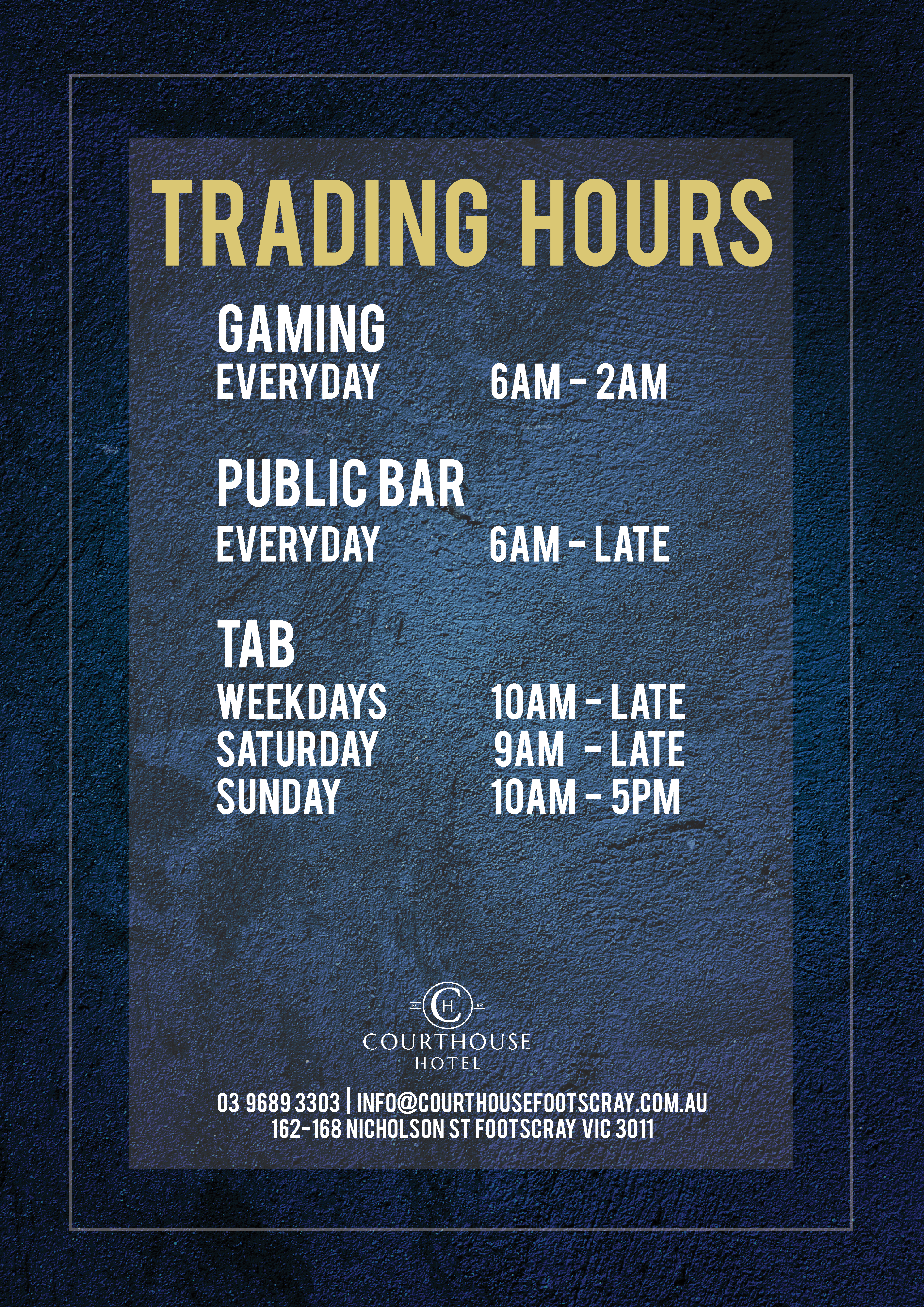 Courthouse Hotel is a multifaceted venue featuring a lively Public Bar with full TAB and Keno facilities, outdoor space and gaming room. The venue, located on Footscray’s bustling Nicholson Street, has been pouring pints for punters for decades and continues to be a community hub for locals of the inner west.